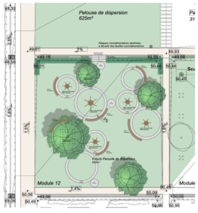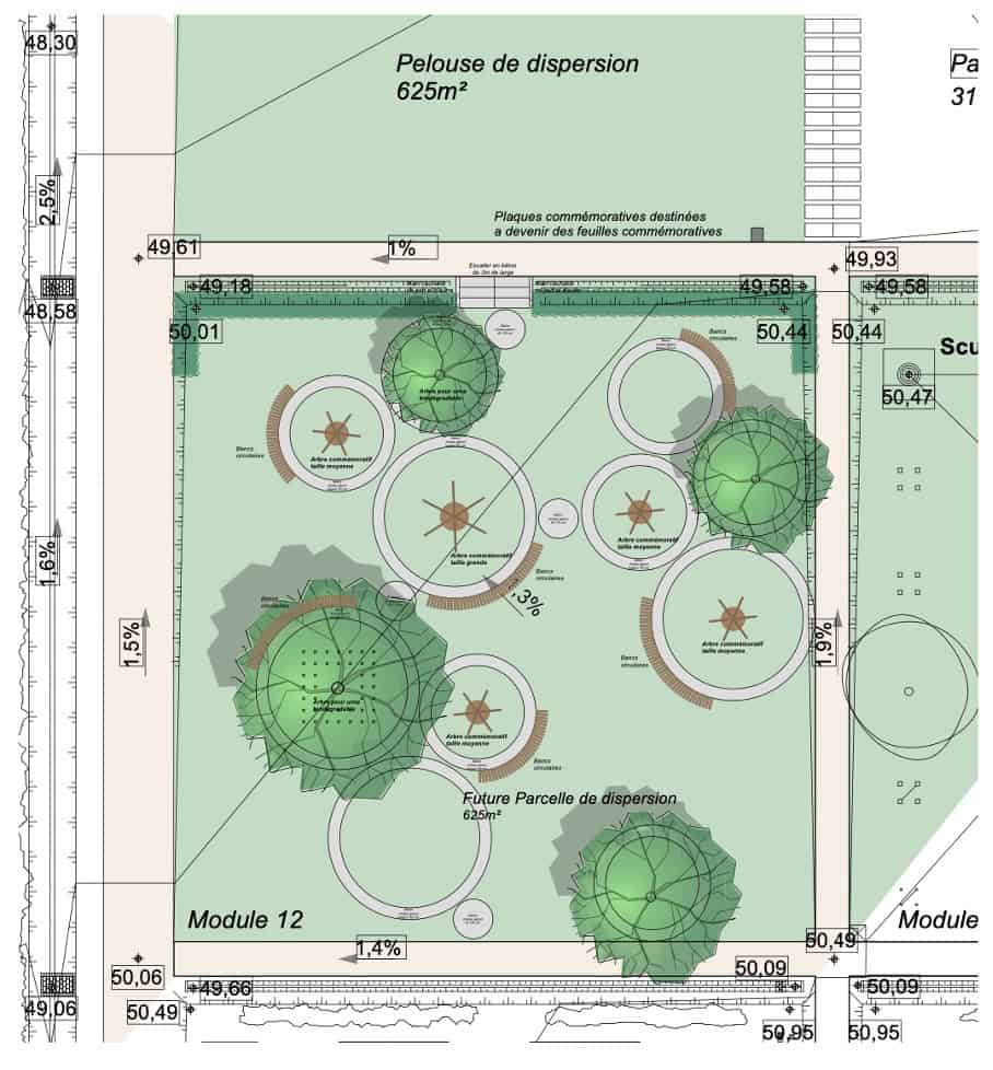 A plan featuring five memorial trees was developed for a 28-by-28-meter plot.